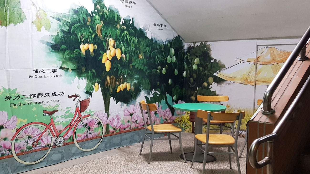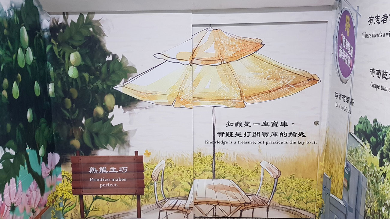 「知識的力量」與「熟能生巧」為主題,結合自然元素與人文景觀,創造出猶如置身於鄉村庭院般的閱讀環境。牆面設計採用手繪風格,描繪茂盛的樹木、花卉與陽光灑落的戶外咖啡座,營造出悠閒且富有詩意的場景。同時,巧妙融入具有啟發性的中英文名言標語,如「知識就是力量(Knowledge is power)」與「熟能生巧(Practice makes perfect)」,鼓勵學生在學習中持續努力,培養閱讀與實踐並行的觀念。