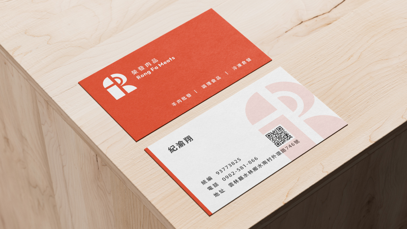 除了標誌設計,我們也負責製作了簡潔明瞭的名片設計。正面突顯了榮發肉品的主要營業項目——羊肉批發、調理食品與冷凍倉儲,而背面則清晰呈現聯絡資訊,確保信息一目了然,方便客戶迅速聯繫。