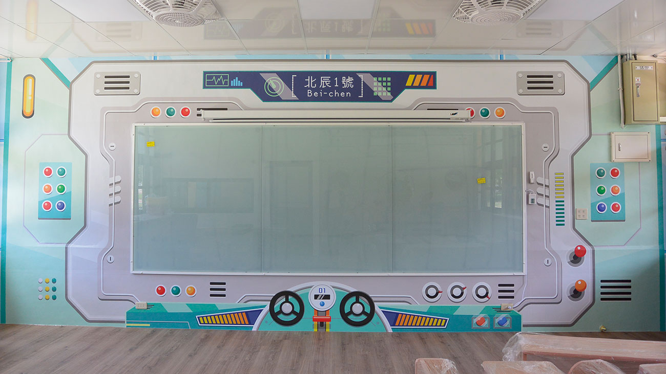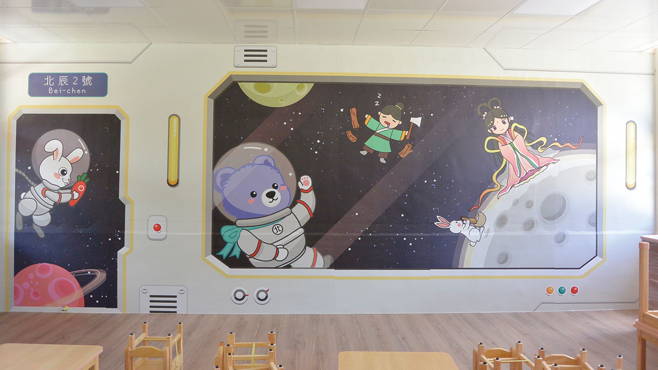 牆面設計以「宇宙探險與奇幻世界」為主題,打造出充滿童趣與想像力的學習環境。我們透過飛船內裝設計,搭配可愛角色,如恐龍、貓咪與長頸龍,營造孩子們探索外太空的氛圍。背景細節加入飛船控制面板、宇宙景色與趣味小窗戶,使空間更具互動感,同時採用柔和飽和色彩,提升視覺吸引力並保持溫馨氛圍。