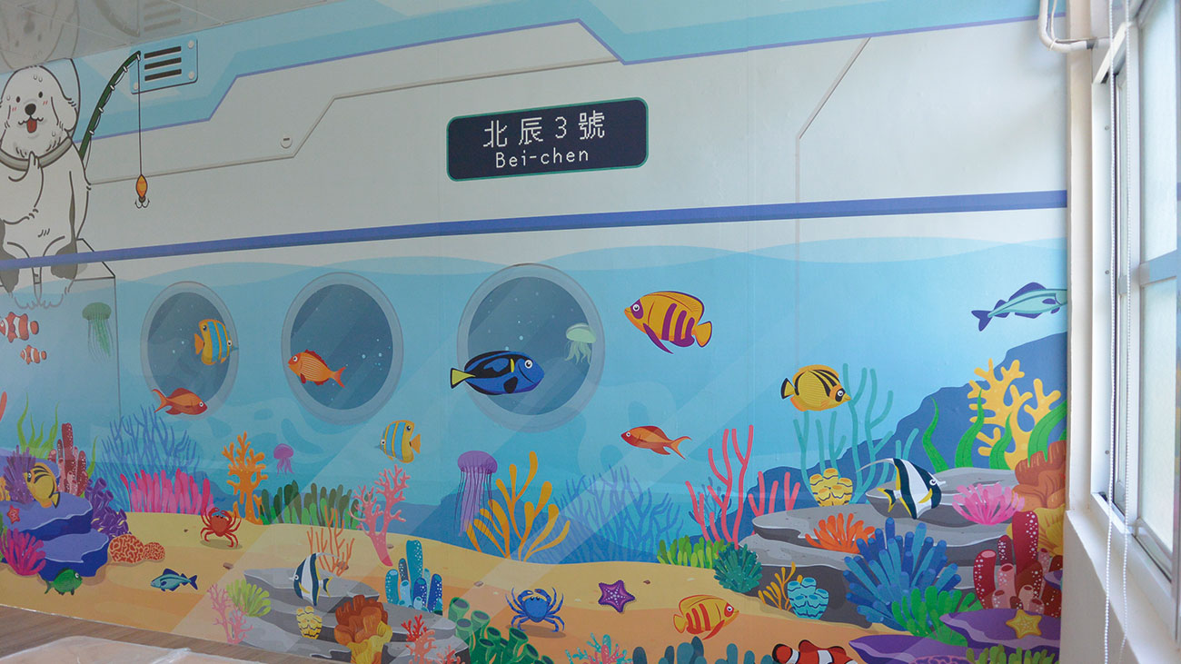 每面牆呈現不同的故事,如烘焙區的恐龍與貓咪合作製作點心,象徵創造力與團隊合作;學習區則以宇宙場景啟發孩子對未來與科技的想像;海洋探索區運用潛水艇窗戶視角,帶來沉浸式的海洋學習體驗。我們希望這樣的設計不只是裝飾,而是讓孩子們在遊戲與學習中,自然培養探索精神與好奇心!